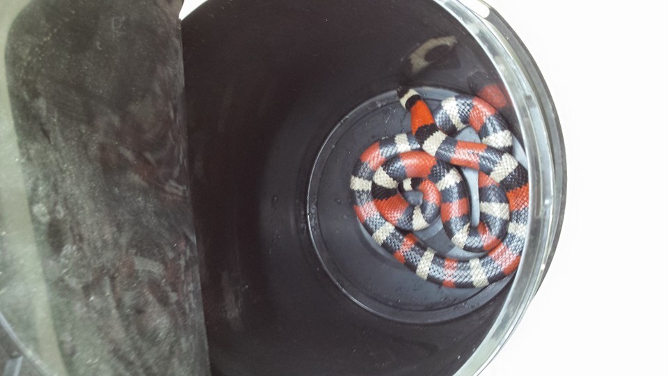 Het politieteam Langstraat deelt het volgende mede. Een bewoner aan de Geerde in Waalwijk trof in zijn tuin onderstaande slang aan. De dappere bewoner heeft deze slang inmiddels gevangen en in een emmer geplaatst. Een gespecialiseerd bedrijf heeft de slang onder zijn hoede genomen.